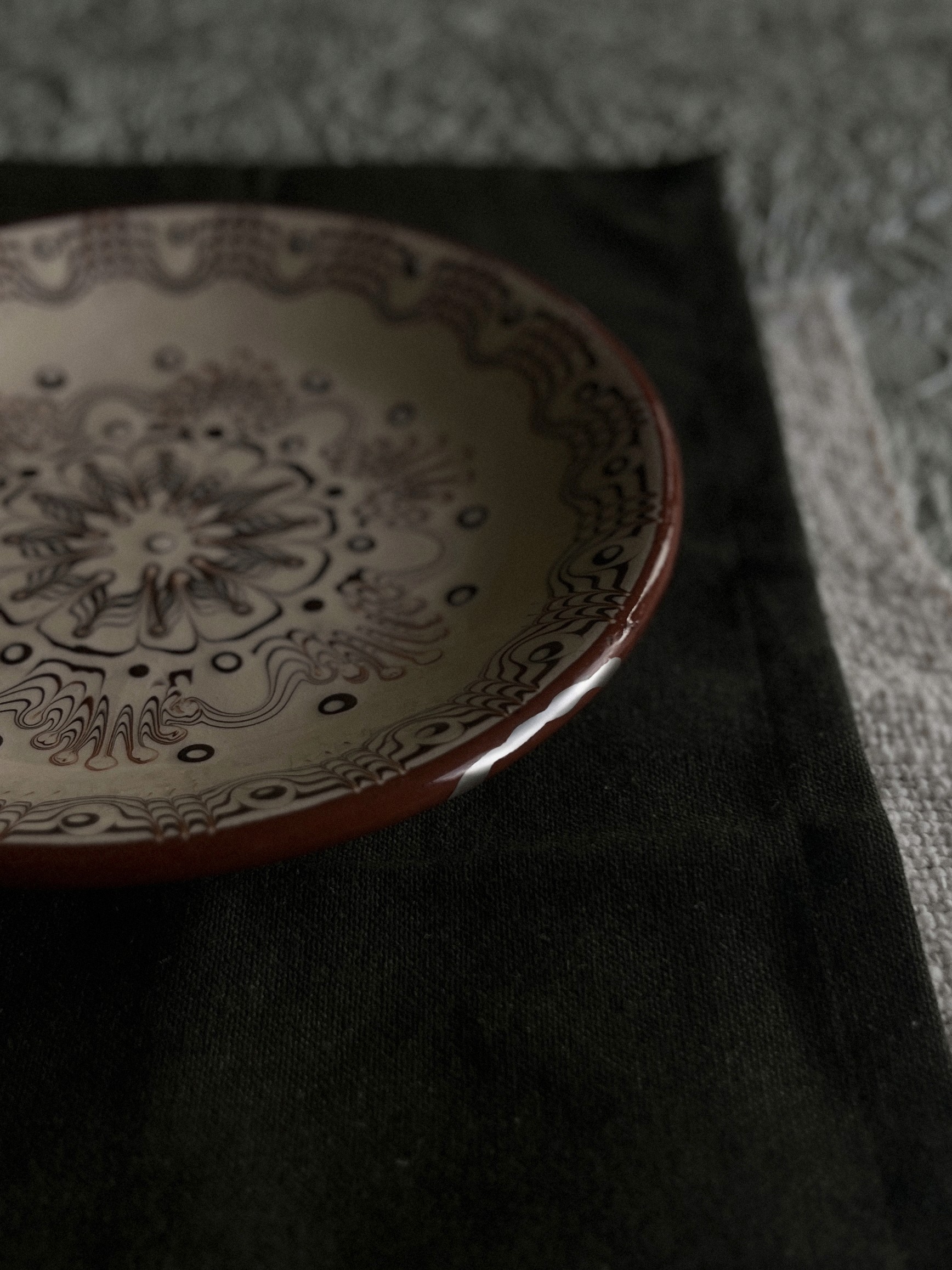 Using locally sourced clay, the potter shapes and fires each piece by hand, after which a painter decorates it on a spinning wheel—dripping glaze from a spout to create the floral patterns that bloom outward in Troyan’s distinctive style.