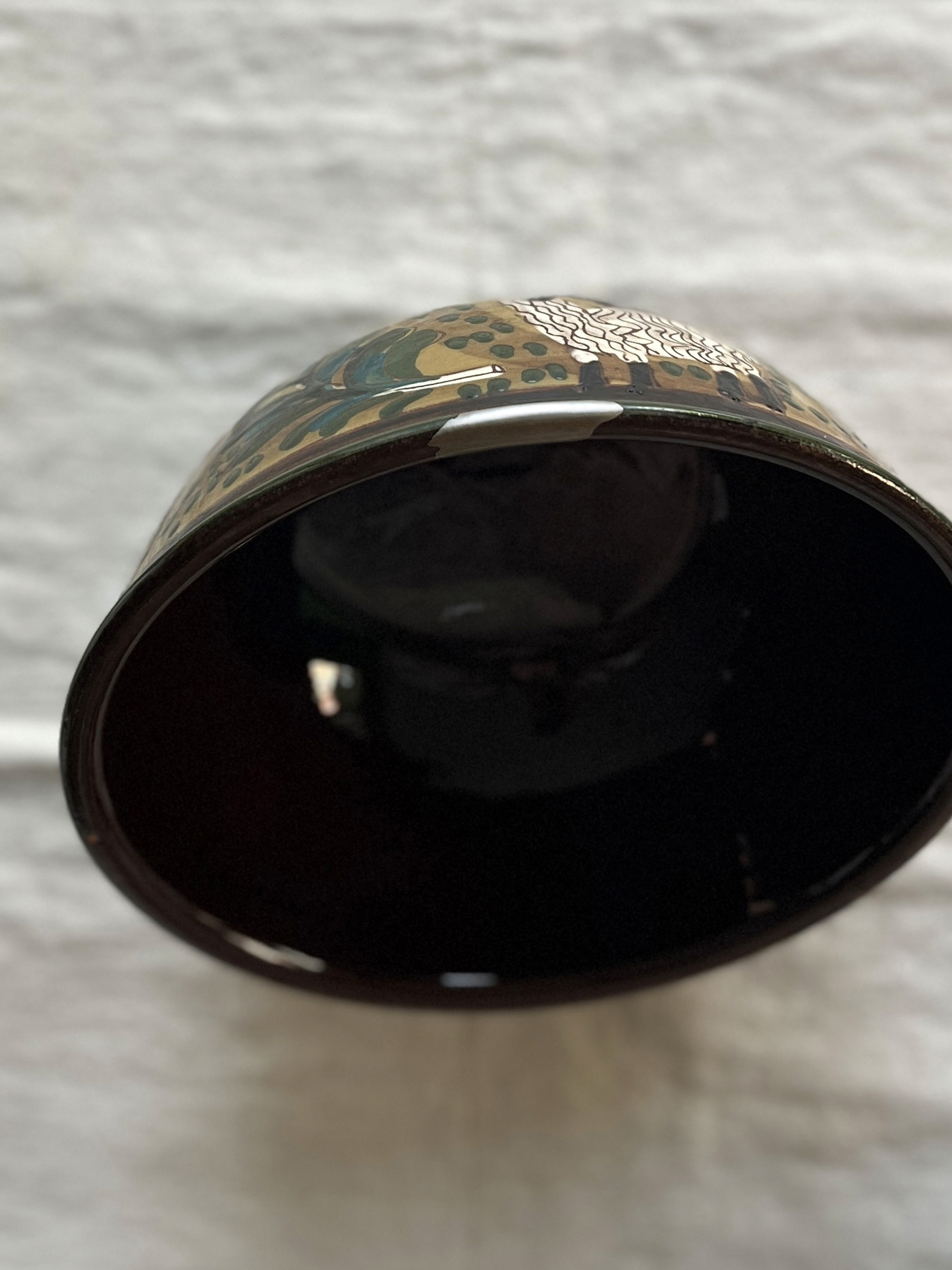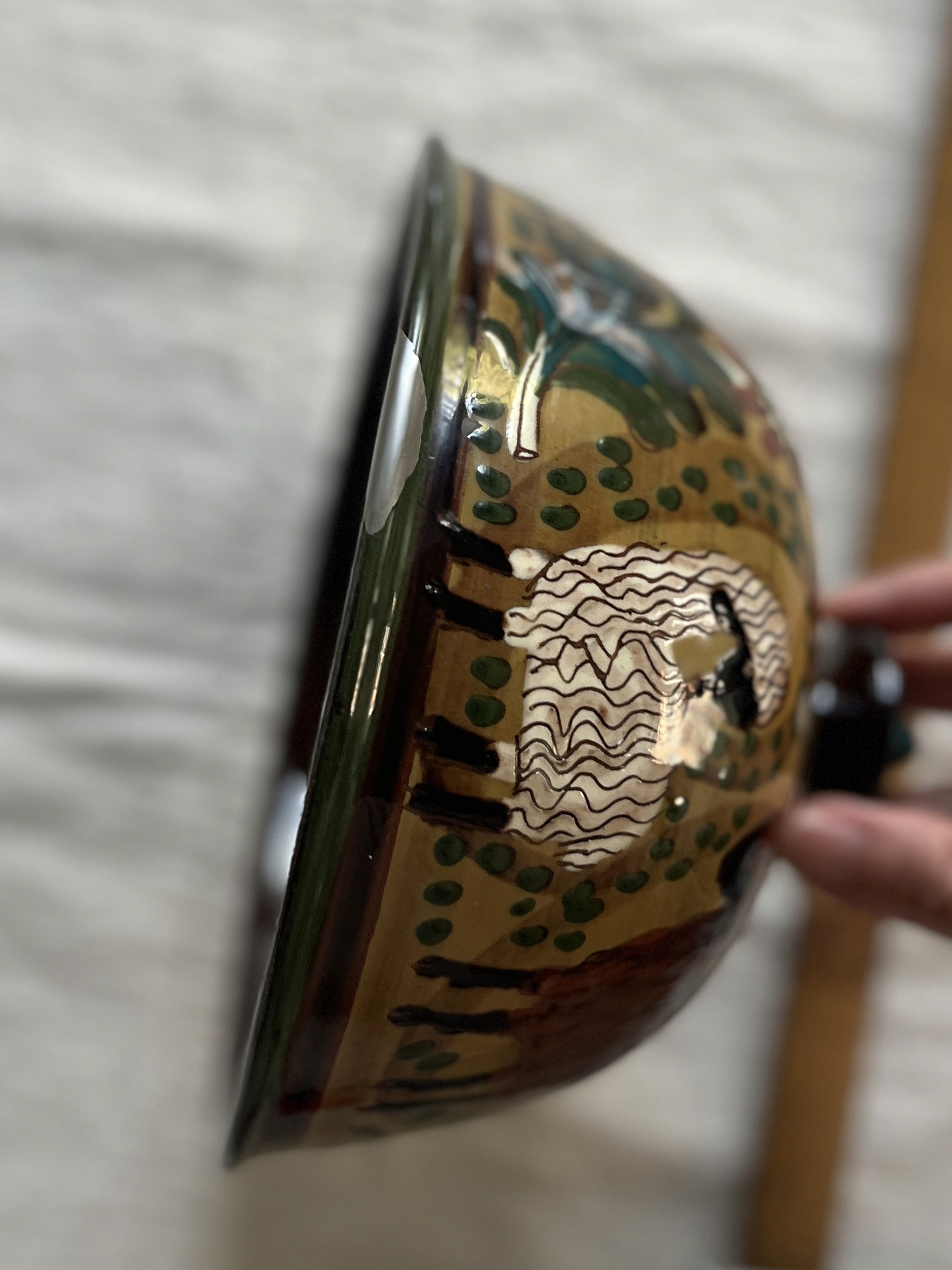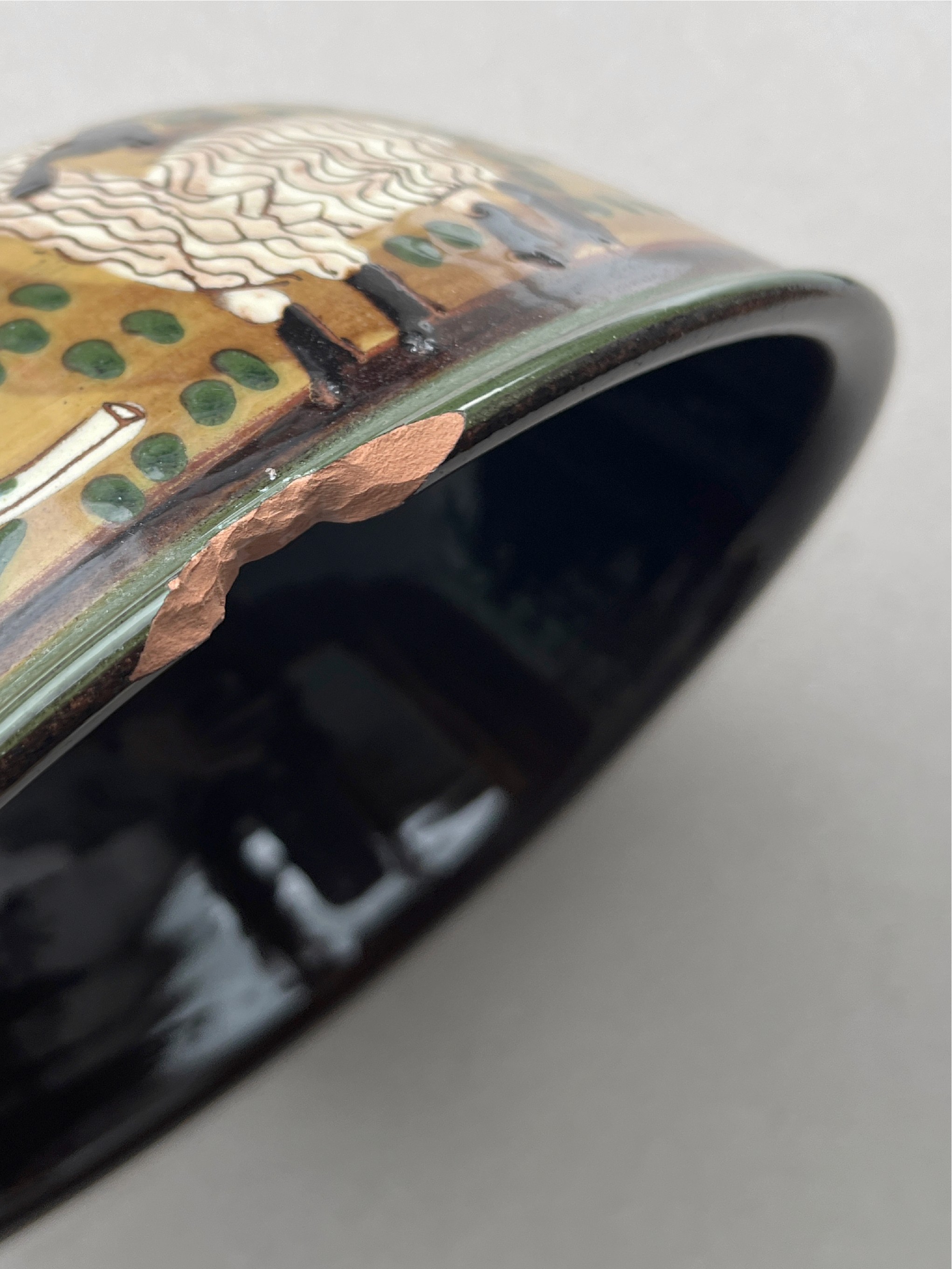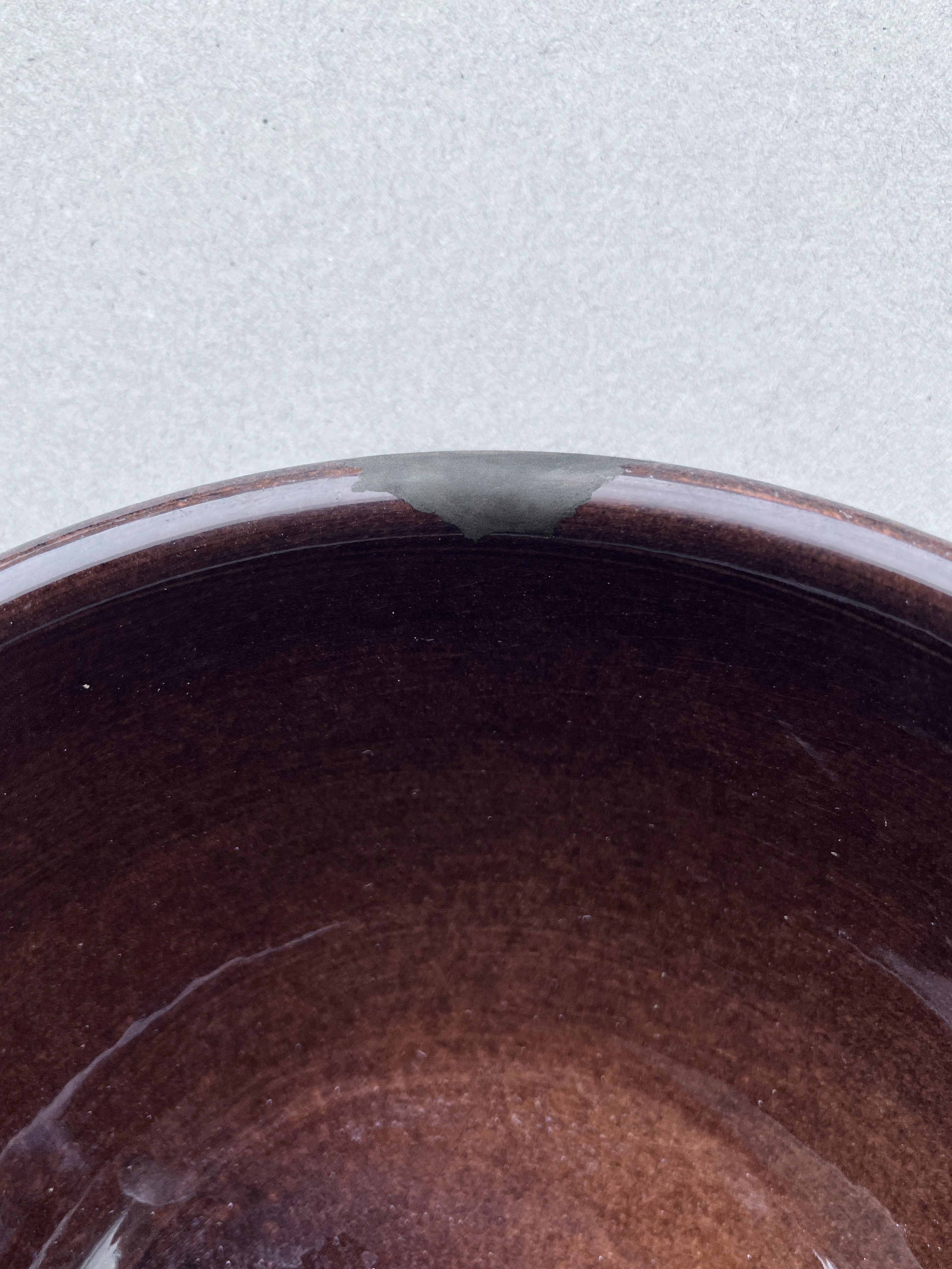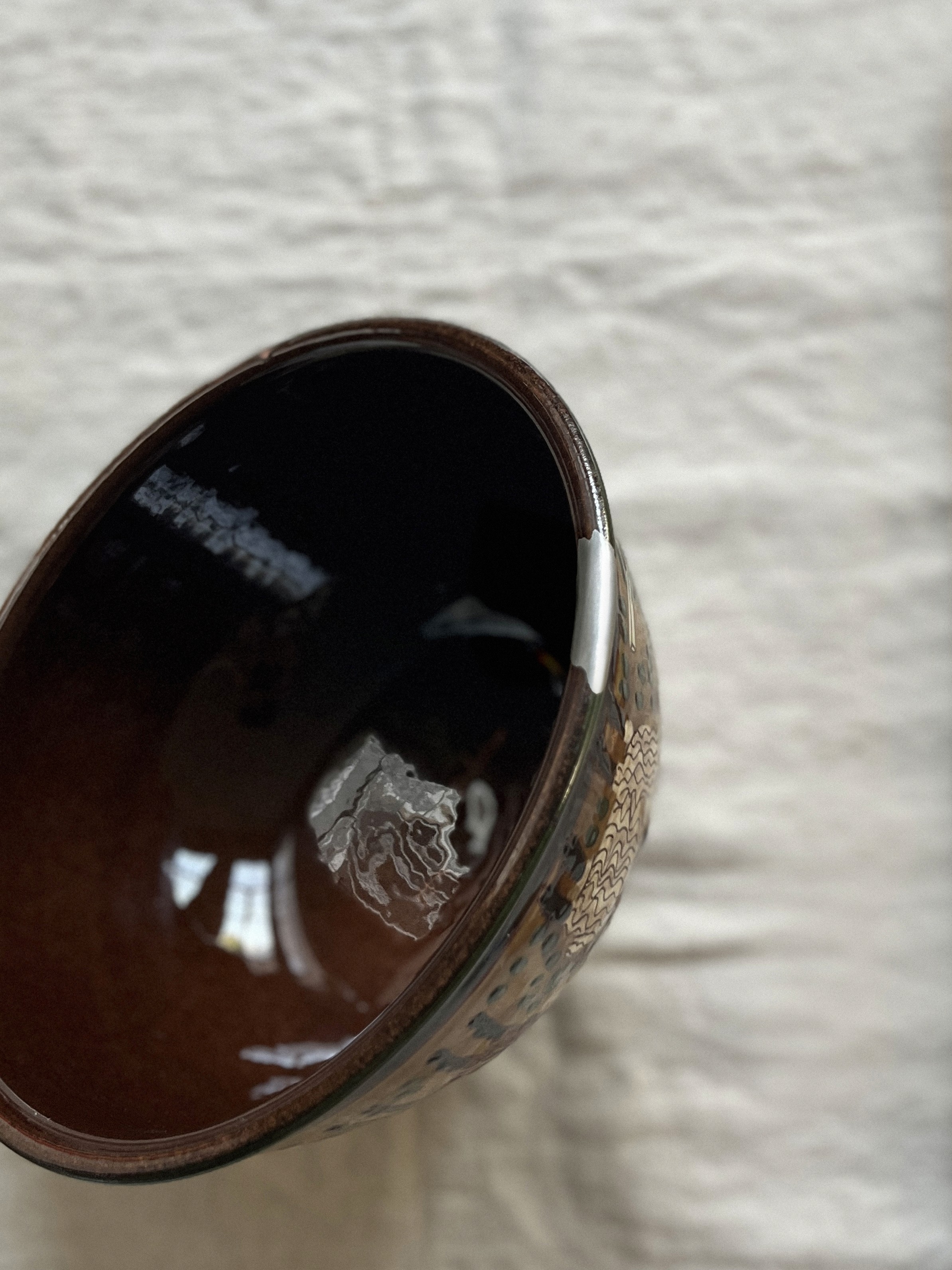 The chipped area was gradually rebuilt in multiple stages using traditional materials called kokuso (a mix of raw urushi lacquer and wood powder) and sabi (urushi mixed with burnt clay).